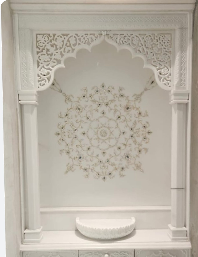 Our mandir inlay work combines traditional artistry with fine craftsmanship, featuring detailed marble and Mother of Pearl inlay for garbhagriha, walls, flooring, and decorative panels. Inspired by classical Indian motifs, each creation is designed to elevate devotion spaces with grace, harmony, and enduring craftsmanship.