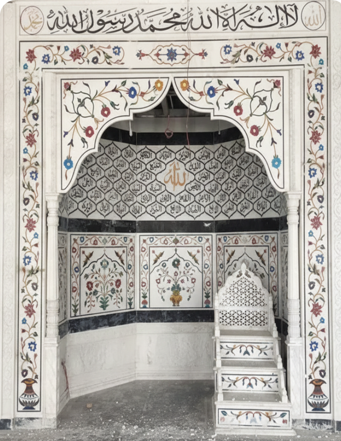 We specialize in elegant marble inlay and Mother of Pearl work for masjids, including mihrab, mimbar, arches, walls, and flooring. Our designs reflect Islamic geometric patterns and floral motifs, crafted with precision to enhance spiritual serenity, symmetry, and timeless beauty within sacred spaces.